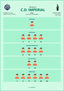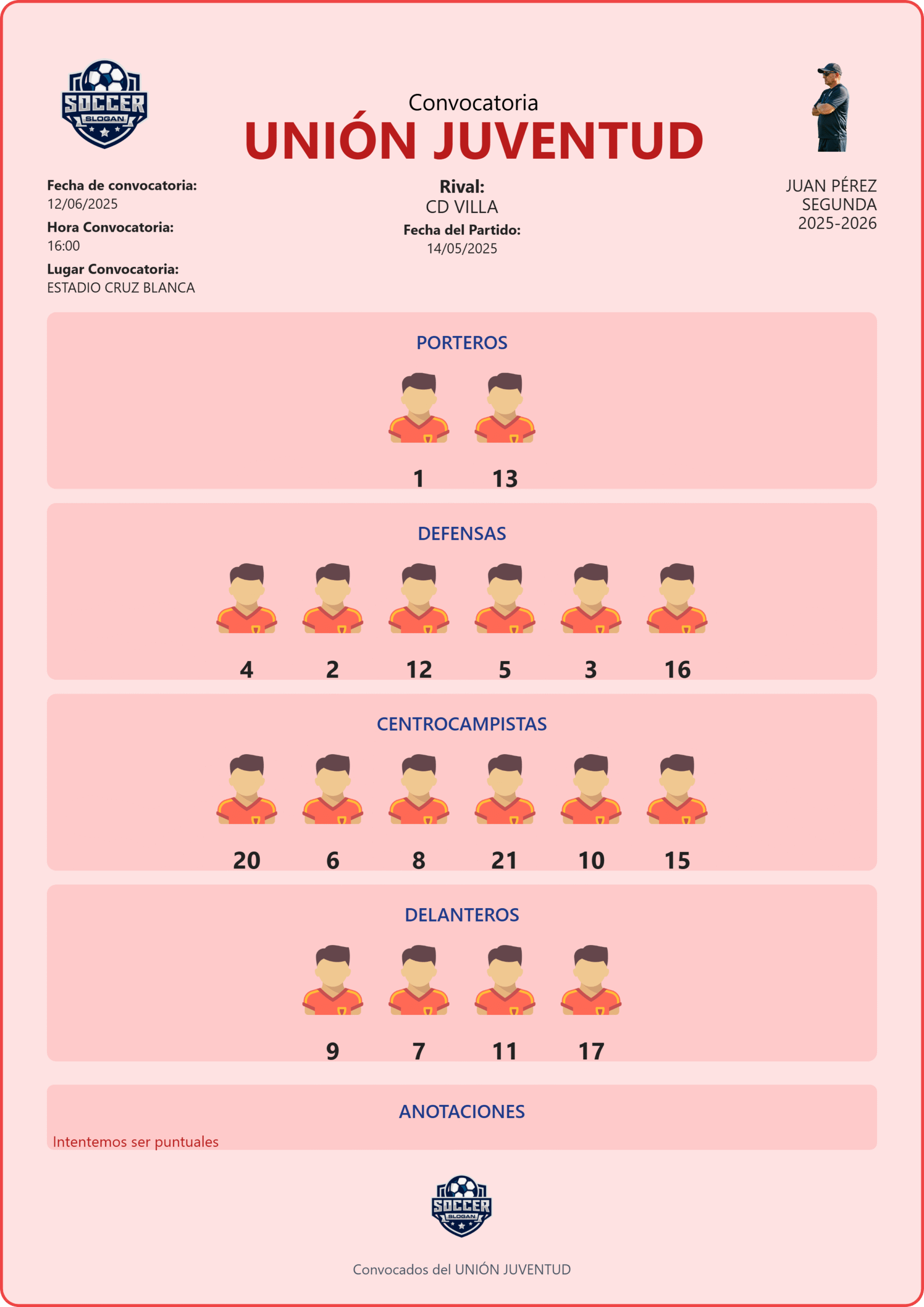 Crea tus alineaciones en 1 minuto con un aspecto increible, con la imagen y dorsal de tus jugadores. Personalizala con tus datos y color del equipo.