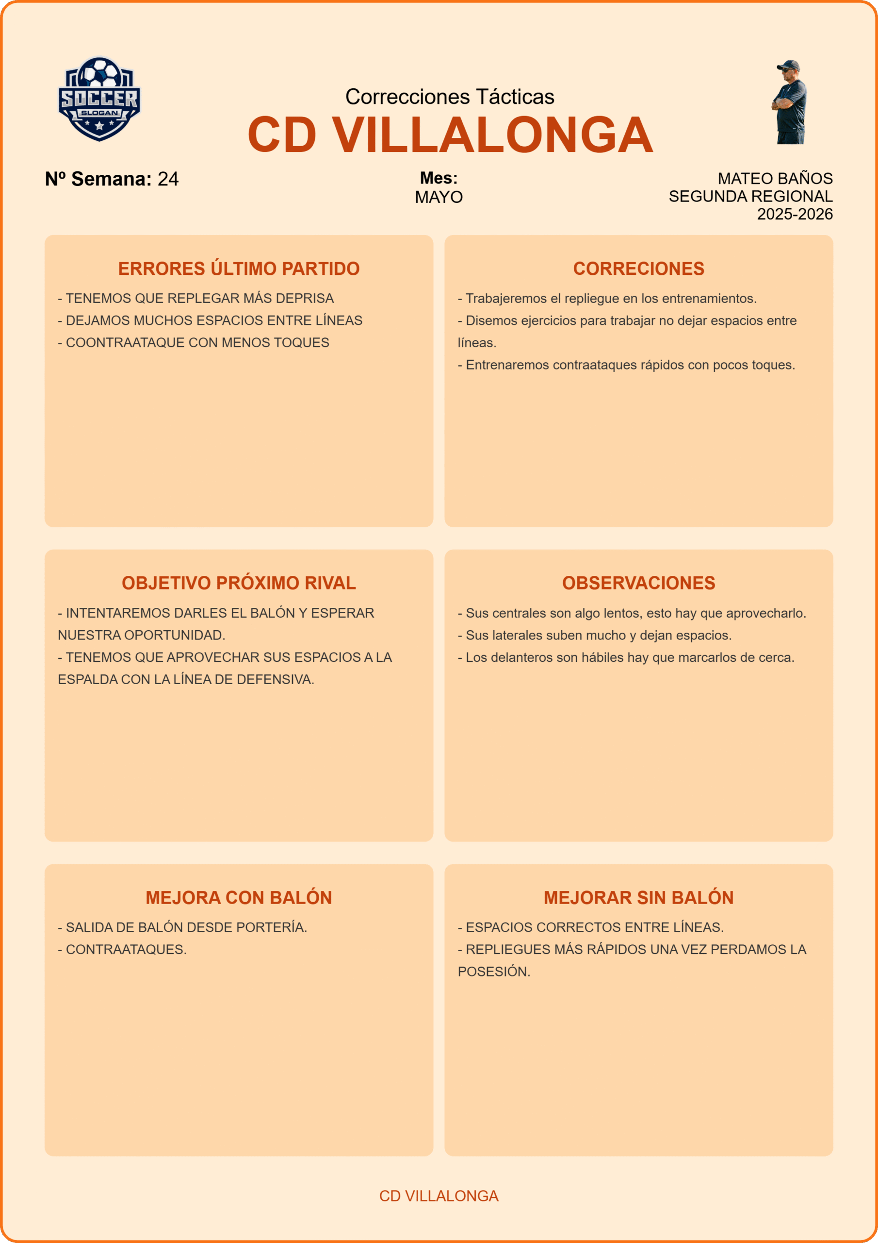 Anota todos los detalles de tu equipo que quieres mejorar durante la semana, después personaliza con tus datos y colores e imprime en A4 o A3.